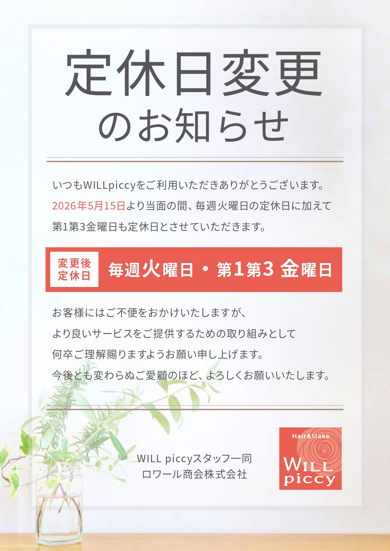 2026年5月15日より当面の間、毎週火曜日の定休日に加えて第1第3金曜日も定休日とさせて頂きます。